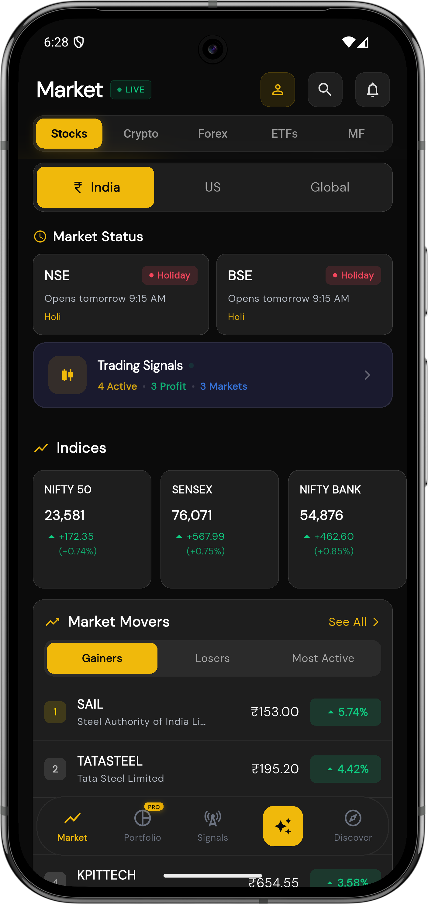 Real-time signals, AI analysis, portfolio tracking, and premium market data — all in one app. Built for the next billion investors.